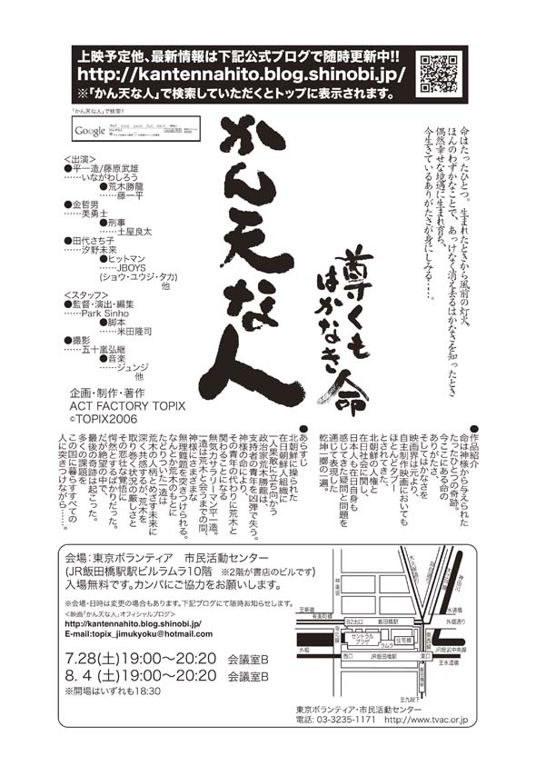 映画「かん天な人」「てんせいな人」を始めACT FACTORY TOPIXの作品情報、米田隆司、Park Sinhoの主張、メッセージなどをお知らせします。